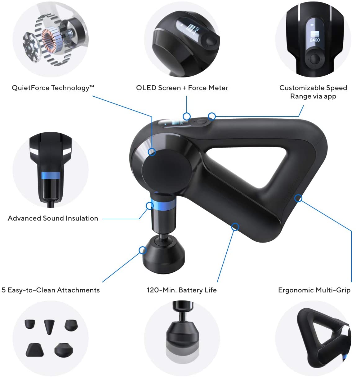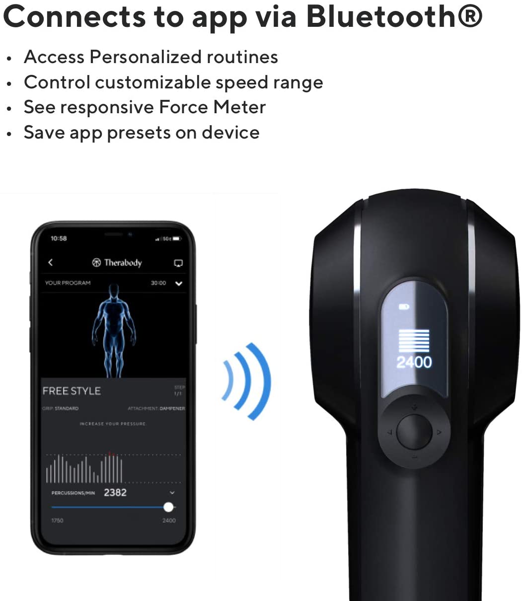 - CUSTOMIZABLE SPEED RANGE & OLED SCREEN - monitor current speed and force on OLED screen, access any speed between 1750-2400 PPMs via Therabody app
