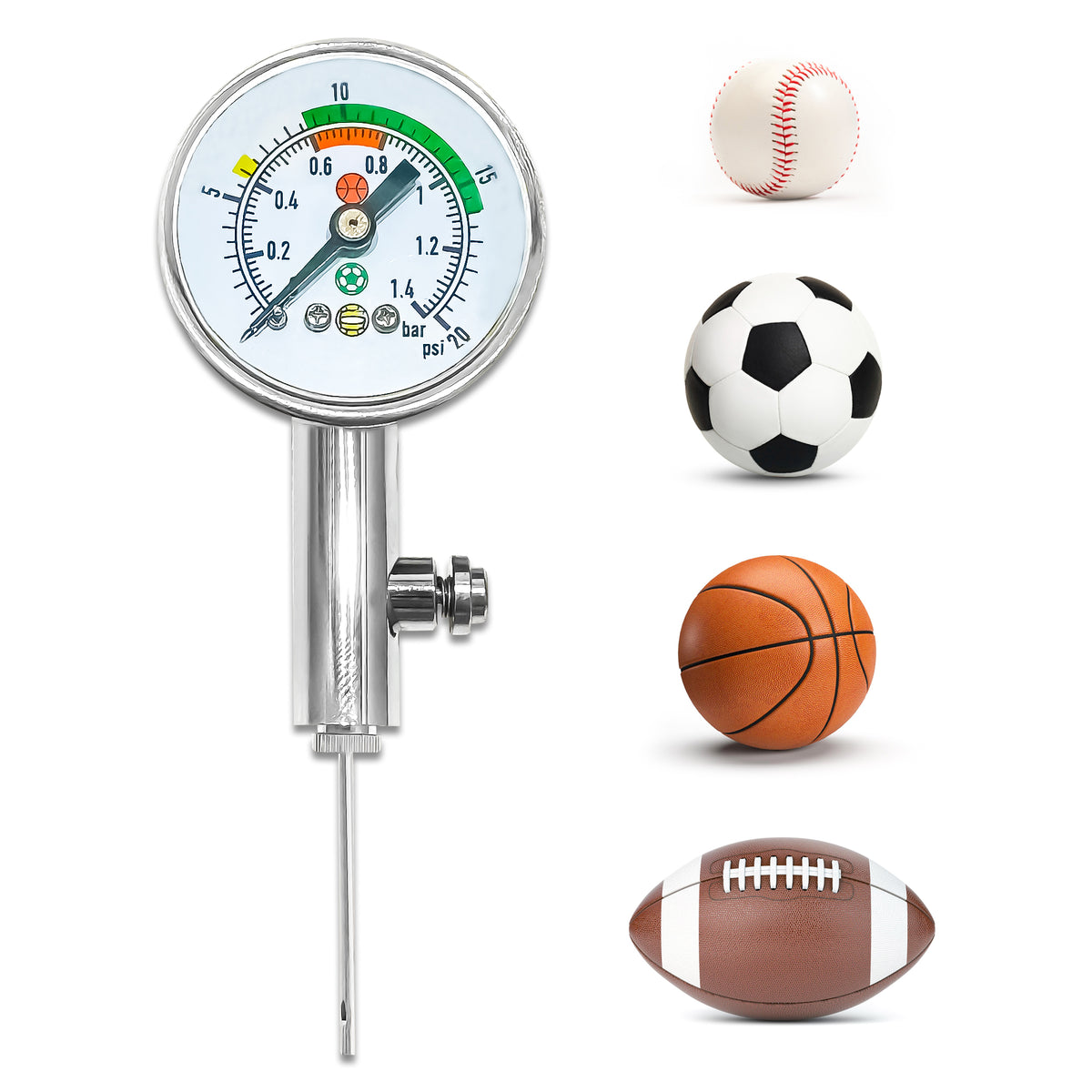 PRACTICAL AND SIMPLE: Push type air release valve easily released under pressure to avoid over inflation. Insert the needle into the ball valve, and you can take the reading in just a second. Works for ALL inflatable balls. Soccer ball, Rugby, water balls, basketball, volleyball, and spike ball!